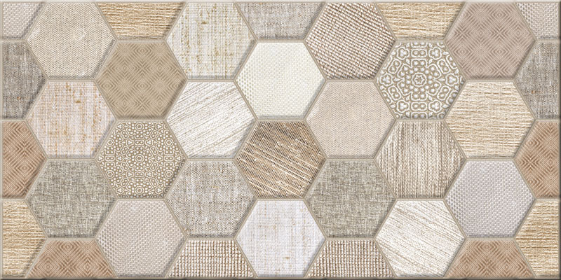 Матовая настенная плитка Asteria от Уралкерамика доступна в нескольких вариантах исполнения. Светло-бежевая и темно-бежевая керамика выполнена с ровной и рельефной поверхностью. Один из модулей рельефного кафеля будто поделен на небольшие квадраты с трехмерной пирамидальной гранью, а другой составлен из гексагонов, имитирующих кусочки разных по рисунку и плетению тканей. Модуль в виде сот ассоциируется с техникой лоскутного шитья и перекликается с подобным декором, также собранным из «лоскутков»-шестиугольников.