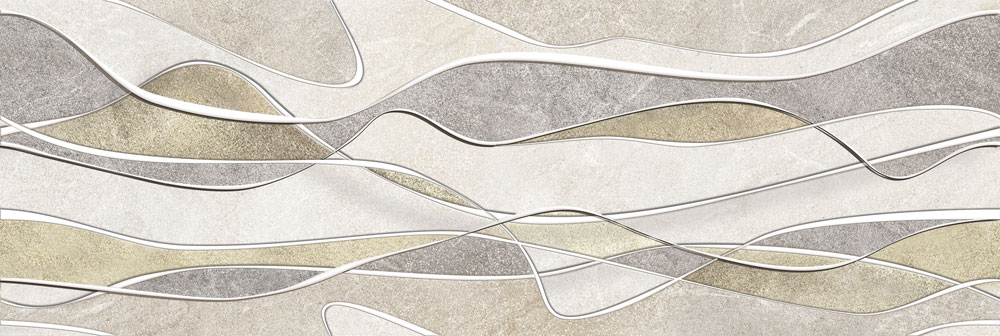 В поддержку гладкой керамики созданы рельефные модули-компаньоны с волнообразным рисунком. Объем рождает игру светотени, что делает цвет кафеля богаче и глубже. Стилизацию на тему волны вы увидите на декоре, который создан в виде каменной инкрустации, выполненной в технике гидроабразивной резки. Швы между элементами играют декоративную роль, поэтому хорошо проработаны.