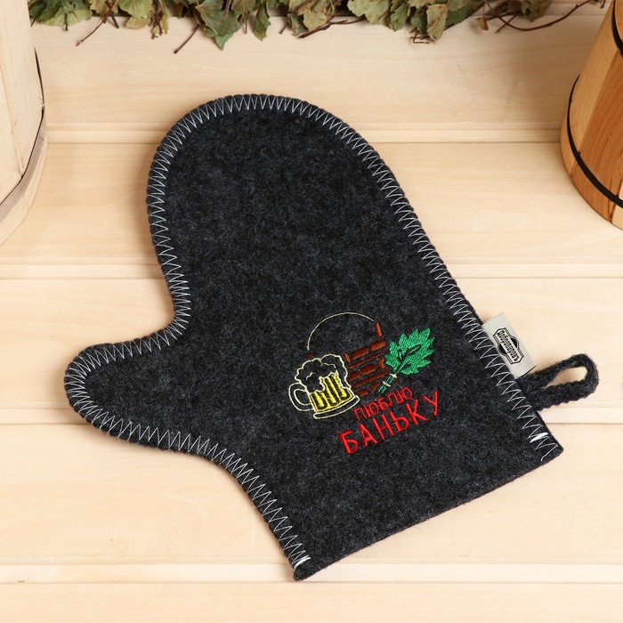 -----Рукавица для бани с вышивкой "Люблю баньку", серая