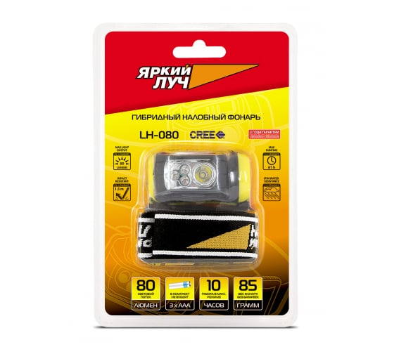 Фонарь ЯРКИЙ ЛУЧ LH-080 налобный, светодиод CREE 3W 80лм + 3 красных LED, 3 режима, на 3xAAA