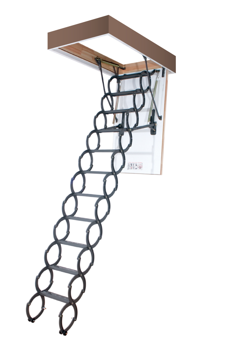 Боковые элементы лестницы, выполненные в форме буквы «S», используются в качестве поручней. Специальный механизм регулировки угла открывания крышки люка позволяет подогнать высоту лестницы под высоту потолка.